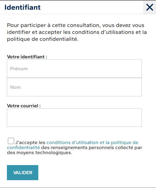 Pour participer à cette consultation, vous devez vous identifier et accepter les conditions d'utilisations et la politique de confidentialité.