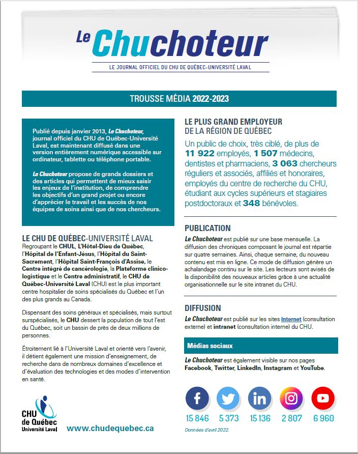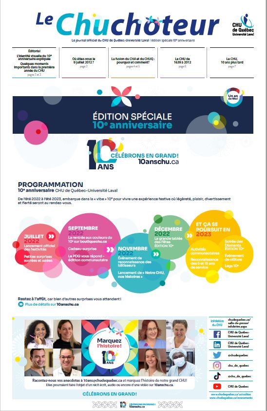Publié depuis janvier 2013, Le Chuchoteur est le journal officiel du CHU de Québec-Université Laval. Il propose de grands dossiers et des articles qui permettent de mieux saisir les enjeux de l’institution, de comprendre les objectifs d’un grand projet ou encore d’apprécier le travail et les succès de nos équipes de soins ainsi que de nos chercheurs.