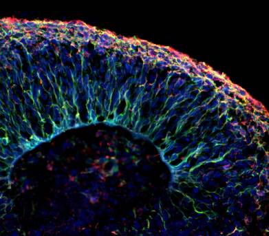 L’image représente un « mini cerveau » généré en laboratoire qui permet à l’équipe d’étudier le développement du cerveau chez l’humain en condition physiologique ou pathologique. Les marquages par immunofluorescence révèlent les progéniteurs neuronaux en vert (NESTIN) et les neurones en rouge (TUBB3).