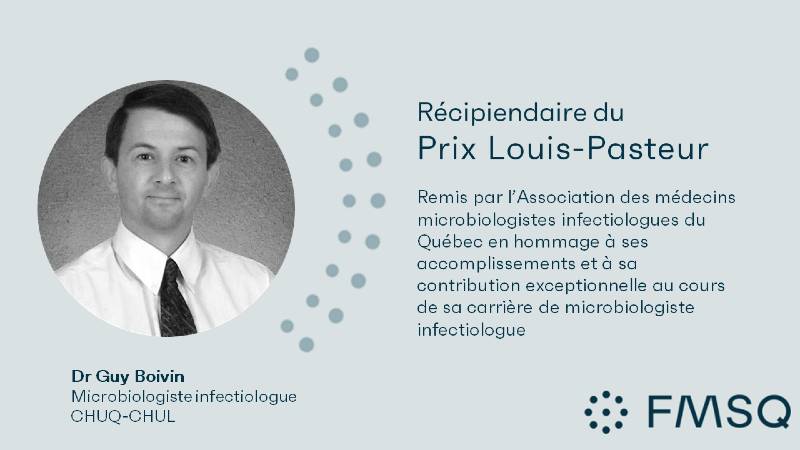 Le Dr Guy Boivin, clinicien et chercheur au CHU de Québec-Université Laval, s’est vu remettre le prix Louis-Pasteur de la Fédération des médecins spécialistes du Québec (FMSQ), en hommage à ses accomplissements et à sa contribution exceptionnelle au cours de sa carrière de microbiologiste-infectiologue.