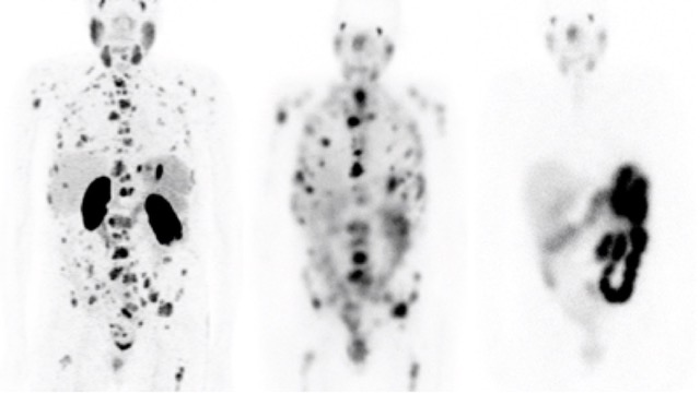 L’imagerie TEP au 68Ga-PSMA-11 de ce patient atteint de cancer de la prostate métastatique montre la présence de la cible PSMA au niveau de la multitude de métastases osseuses (gauche). L’imagerie scintigraphique suite au premier traitement de 177Lu-PSMA-617 confirme l’excellent ciblage des lésions par le traitement (centre). L’imagerie après le 4e cycle montre la quasi-disparition des lésions, soit une excellente réponse thérapeutique (droite; le placard noir est l’activité excrétée par l’intestin).