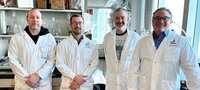 Photo principale : de gauche à droite : Dominic Gagnon, professionnel de recherche dans le laboratoire du Pr Richard; Christopher Bérubé, stagiaire postdoctoral en chimie médicinale dans le laboratoire du Pr Biron; Dave Richard, chercheur de l’axe Maladies infectieuses et immunitaires au CRCHU et spécialiste de la malaria; Éric Biron, chercheur de l’axe Endocrinologie et néphrologie spécialisé dans le développement de nouveaux agents thérapeutiques.