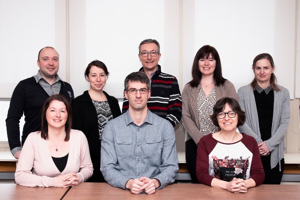 Première rangée (assis), de gauche à droite : Geneviève Asselin, Martin Bussières et Brigitte Larocque, agents de planification, de programmation et de recherche (APPR). Deuxième rangée (debout) : Sylvain L’Espérance,(APPR, Marianne Talbot, physiothérapeute et chargée de projet en transfert des connaissances, Dr Marc Rhainds, cogestionnaire médical et scientifique des activités d’ETMIS, Renée Drolet, APPR, Dre Alice Nourissat, médecin-conseil en ETMIS.