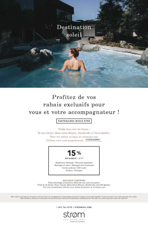 Petit rappel : vous avez en tous temps 15 % d’escompte au Strøm spa nordique. Profitez-en!