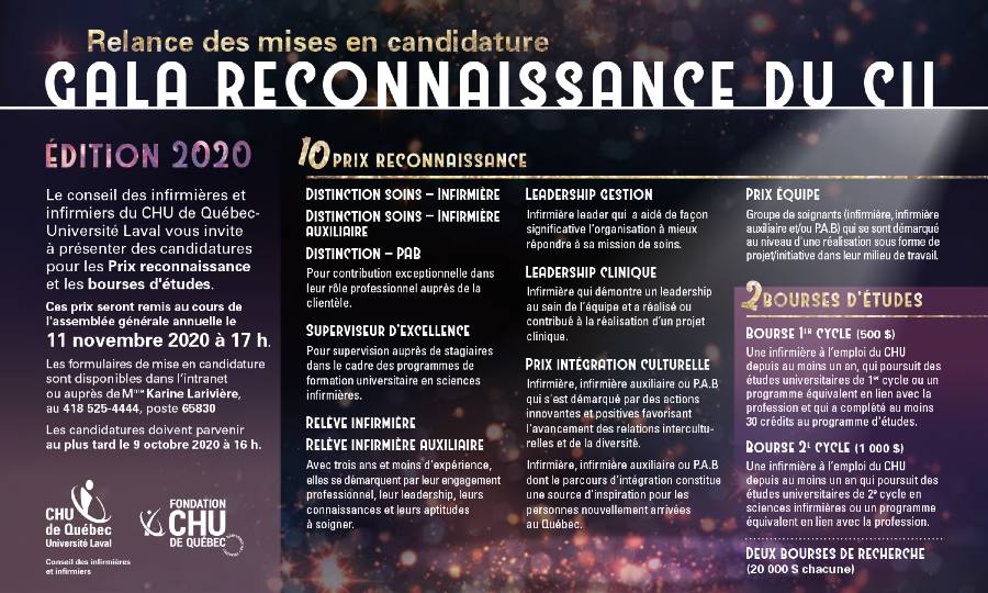 Lors de son assemblée générale annuelle qui s’est tenue le 17 septembre dernier, l’Ordre régional des infirmières et infirmiers de Québec (ORIIQ) a dévoilé les gagnants de ses différentes bourses et prix. Sur un total de 20 catégories, le CHU en a raflé 10 à lui seul! Voici les récipiendaires de chaque bourse et prix :