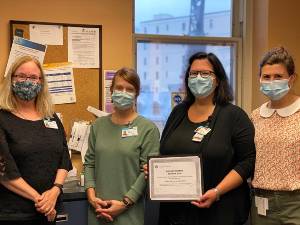 Josée Gaudreault, chef de service, infirmière praticienne spécialisée et recherche, Kathy Baillargeon, infirmière praticienne spécialisée en soins adulte et membre du comité de promotion de l’excellence de l’ORIIQ, Julie Dupont et Anne-Sophie Delage, infirmière praticienne spécialisée en soins adulte, volet néphrologie.