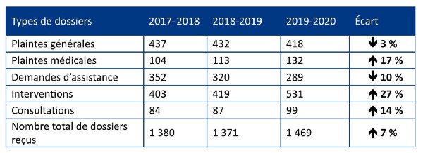 Au cours de l’exercice 2019-2020, 1 469 dossiers ont été ouverts au Bureau du commissaire aux plaintes et à la qualité des services.