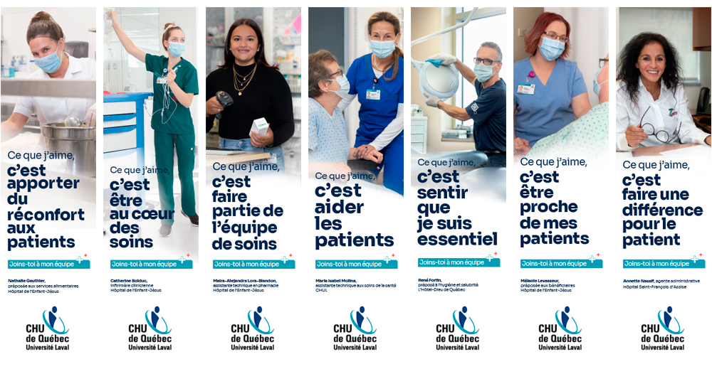 Évidemment, nous aurions aimé mettre en valeur tous les titres d’emploi du CHU dans cette campagne, car tout le monde est essentiel au bon fonctionnement de notre organisation et à la réalisation de notre mission. Cependant, nous avons dû faire des choix pour éviter de diluer notre message.