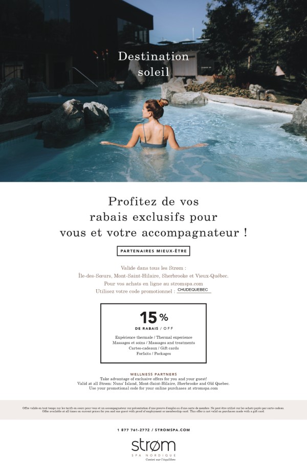 Petit rappel! En tant qu’employé du CHU de Québec-Université Laval, vous avez en tout temps 15 % de rabais dans plusieurs StrØm Spa.