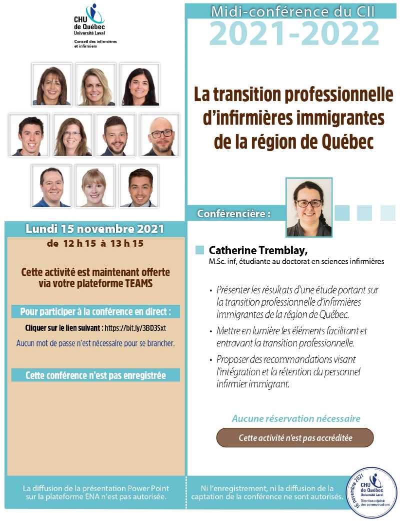 Quant à Karine Larivière, elle est impliquée dans l’organisation du Conseil des infirmières et infirmiers (CII) et de ses sous-comités depuis plusieurs années. Elle soutient différentes activités, telles que les midis-CII, le colloque du CII, le gala Reconnaissance et les bourses de formation continue.
