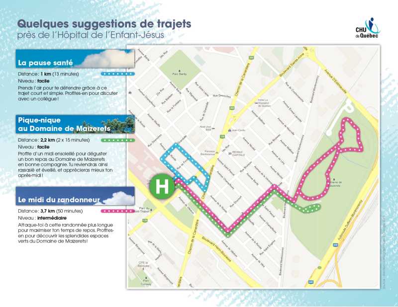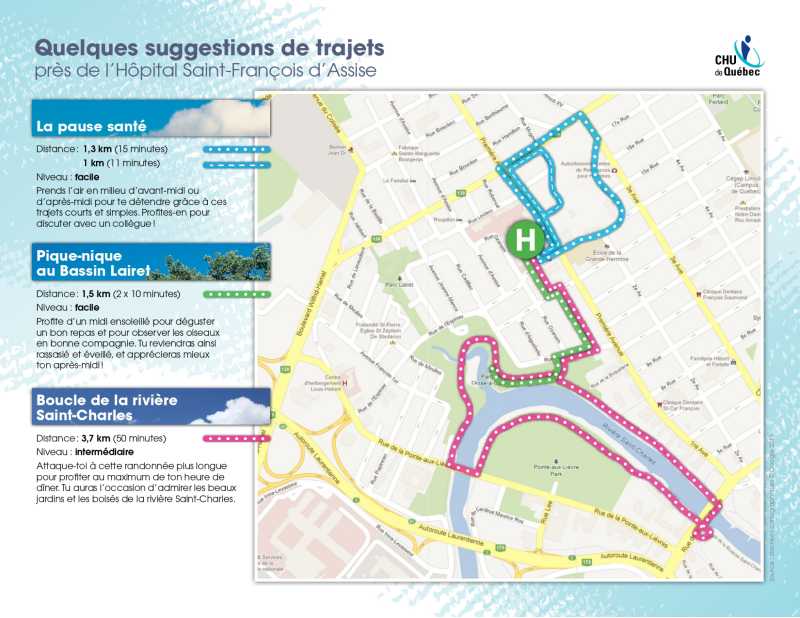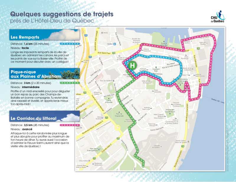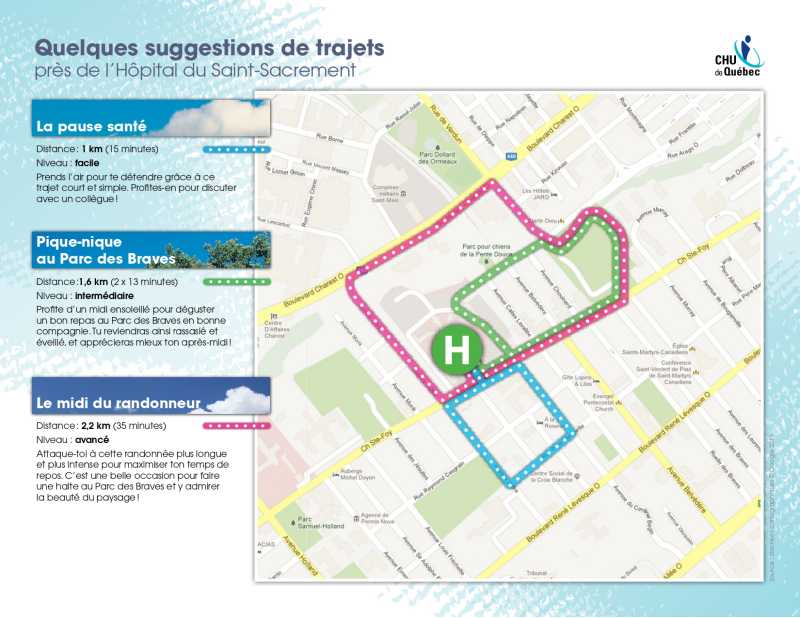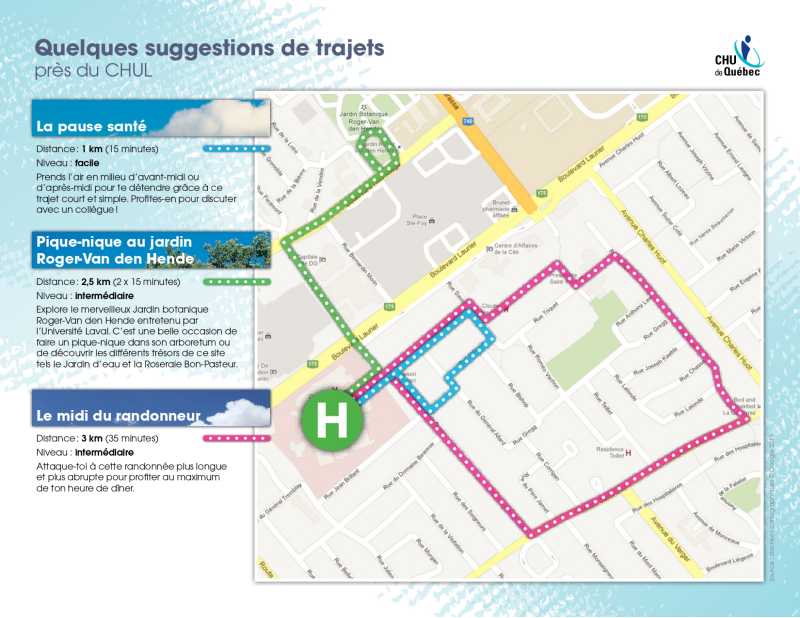Le Service de prévention et mieux-être au travail vous propose des parcours de marche de longueurs variables dans les environs de chacun des hôpitaux du CHU (liens ci-dessous). La marche, c’est une façon simple et accessible de faire du bien à votre santé physique et mentale!