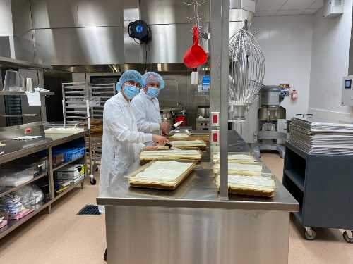 L’équipe des services alimentaires s’active à la plateforme clinico-logistique (PCL)! En effet, depuis le 31 mai dernier, la majeure partie de ce qui est servi aux patients, aux visiteurs et aux employés des cinq hôpitaux du CHU est désormais produite à partir de la PCL.