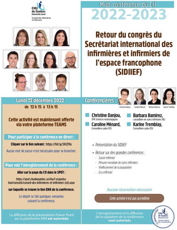 Vous êtes curieux et aimeriez en apprendre un peu plus sur le SIDIIEF et les conférences offertes durant le congrès? Ne manquez pas le prochain Midi-CII prévu le 12 décembre prochain à 12 h 15 : quatre conférencières feront un retour sur cet événement! Les détails sont présentés dans le calendrier du SPOT.