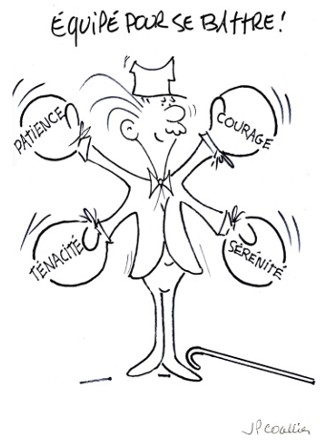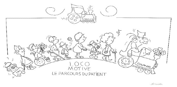 Visuels du parcours Locomotive fournis par le CHUM, 2019. Caricature : Jean-Pierre Coallier.