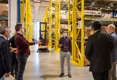 Photo de gauche : M. Benoit Bisson, chef de service, logistique hospitalière - plateforme clinico-logistique, fait visiter le secteur de l'entrepôt. Photo de droite : Mme Caroline Groleau, chef de service, services alimentaires - plateforme clinico-logistique, fait visiter le secteur des services alimentaires.