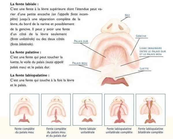 La fente à la lèvre ou au palais n’est pas due à l’absence de tissu ou d’os, mais plutôt à une fusion qui ne s’est pas complètement réalisée lors des premières semaines de grossesse.