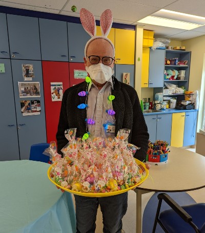 Qui n’aime pas le bon chocolat? Les éducateurs spécialisés du CMES ont organisé différentes activités pour marquer la visite de Jeannot Lapin aux enfants hospitalisés. Chasse au trésor, distribution de chocolat et de cahiers à colorier : le gentil lapin s’est assuré que tous les éléments étaient réunis pour apporter du bonheur dans le cœur de nos petits patients et les faire rêver.