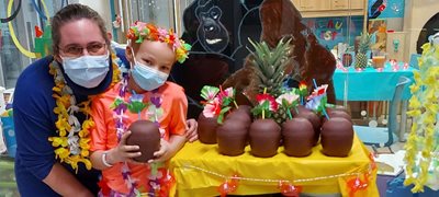 Vanessa, éducatrice à l’Unité d’hémato-oncologie pédiatrique Charles-Bruneau, a réalisé l’idée de la petite Jamie (photo principale) : transporter ses amis de l’unité sur une île hawaïenne le temps d’une journée. Colliers de fleurs, jupes colorées, noix de coco et concours limbo ont permis aux enfants de s’évader pour quelques heures!