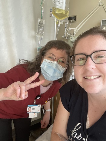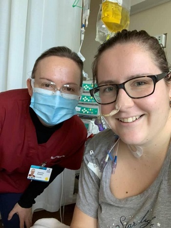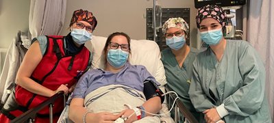 « J’ai tout le temps été bien traitée, bien soignée, que ce soit par les médecins, les infirmières, les infirmières auxiliaires, les préposés, les nutritionnistes, les brancardiers... Mais j’aimerais particulièrement remercier l’équipe d’alimentation parentérale que je vois tous les mois et que j’adore! Il y a deux infirmières, une nutritionniste, l’équipe de pharmacie, la gastroentérologue Dre Cloutier et un chirurgien. Ils sont toujours présents pour moi; ils font un travail exceptionnel. »