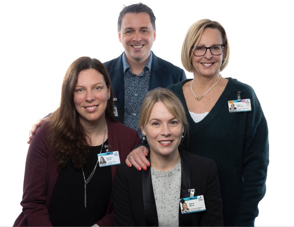 De gauche à droite : Marie-Ève Tessier, commissaire adjointe; Nicolas Rousseau, commissaire aux plaintes et à la qualité des services; Valérie Martel, commissaire adjointe; Diane Blanchet, commissaire adjointe.