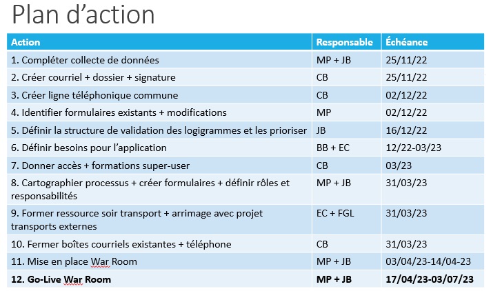 Pour la mise en service, nous avons opté pour un transfert des processus par étape, en se concentrant d’abord sur les processus internes à la DL pour tester le fonctionnement des formulaires et bien former les employés du GALO. Cela nous a aussi laissé du temps pour mesurer le volume de demandes et pour s’ajuster dans notre capacité de prendre en charge de nouveaux processus.