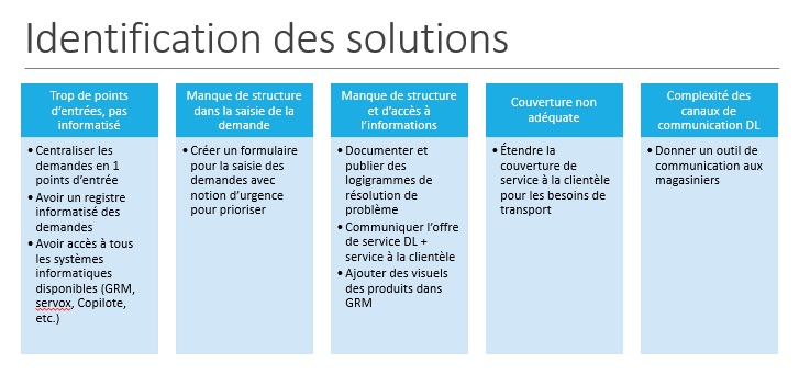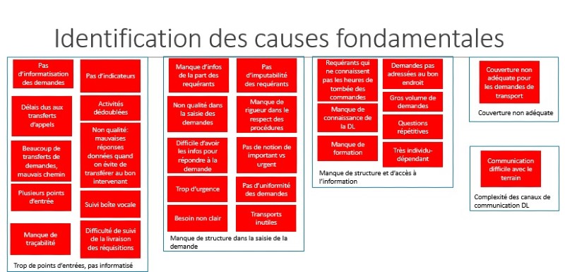 Nous avons ensuite effectué un atelier de type Kaizen avec des intervenants de chacun des secteurs de la logistique et, préalablement, nous avons recueilli les commentaires de clients fréquents. Cette activité nous a permis d’identifier les causes fondamentales de la problématique, de déterminer le processus visé par la démarche et d’élaborer un plan d’action nous permettant d’atteindre nos objectifs.