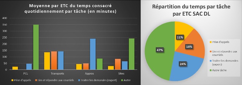 Les graphiques ci-dessous représentent les résultats des observations et des collectes de données. Ils illustrent les types de demandes et la répartition des tâches de service à la clientèle dans les divers secteurs de la DL. L’objectif était de connaître le temps total passé à répondre aux demandes des clients avant la mise en place du GALO.