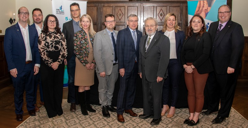 De gauche à droite : Dr Christian Malo, directeur médical du Programme de traumatologie du CHU, M. Jonathan Gendron, PDG d’Opération Enfant Soleil, Mme Rachelle Huard, adjointe au directeur des soins critiques - volet continuums de soins surspécialisés au CHU, Dr Marc-André Dugas, chef du Département de pédiatrie du CHU, Mme Marie-Claude Paré, présidente et chef de la direction de la Fondation du CHU de Québec, M. Stéphane Tremblay, directeur des soins critiques du CHU, M. Gaston Bédard, président du Conseil d’administration du CHU, Dr Pierre Fréchette, pionnier de la traumatologie moderne au Québec, Mme Marie-Josée Laprise, directrice adjointe mère-enfant du CHU, Mme Christine Soucy, chargée de projet - traumatologie pédiatrique au CHU, M. Martin Beaumont, PDG du CHU.