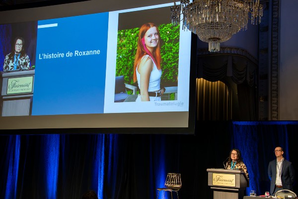 Mme Rachelle Huard et le Dr Christian Malo racontent l’histoire de Mme Roxanne Marcotte lors de la présentation « Trajectoires de soins – parcours d’une jeune polytraumatisée ».