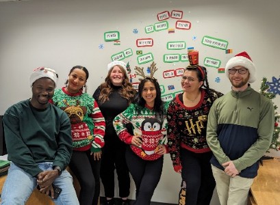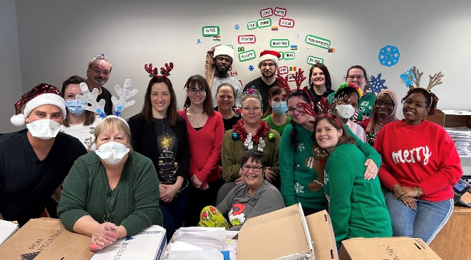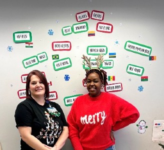 Bureau des archives, CHUL. Marie-Claude Ladouceur, assistante-chef archivistes (à gauche), a fait une petite murale sur son temps personnel sur laquelle il était inscrit les vœux des Fêtes selon les coutumes dans toutes les langues parlées par les membres de son équipe avec un petit drapeau de chaque pays. Sur la photo, elle est accompagnée de Clarisse Niringiye, agente administrative (à droite).