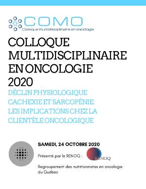 Les nutritionnistes sont fortement reconnues pour leur travail en interdisciplinarité avec les médecins, les pharmaciens et les autres professionnels de la santé. L’organisation du premier colloque multidisciplinaire en oncologie (COMO), le 24 octobre dernier, en a montré un exemple concret. C’est sous le thème « Déclin physiologique : cachexie et sarcopénie, les implications pour la clientèle oncologique », que les conférenciers ont présenté virtuellement les plus récentes données scientifiques.
