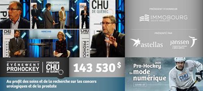 Le Pro-Hockey en mode numérique s’est déroulé le 29 septembre dernier, en trois « périodes ». En matinée, les participants ont pris part à un intense entraînement virtuel mené par M. Gabriel Hardy, préparateur physique et copropriétaire du Gym Le Chalet. Le premier encan virtuel grand public dédié à la cause a ensuite été lancé le midi. Celui-ci proposait des lots attrayants pour les amateurs de hockey et a pris fin le 11 octobre. En soirée, une conférence virtuelle mettant en vedette le maire de Québec, Régis Labeaume, et les Pros (professionnels de la santé, du milieu corporatif et du hockey) a permis aux participants de découvrir concrètement à quoi servent les fonds récoltés, que ce soit par le vibrant témoignage de M. Labeaume ou encore grâce à la visite virtuelle des lieux de travail de l’équipe d’urologie-oncologie et du parcours d’un patient atteint d’un cancer de la prostate.