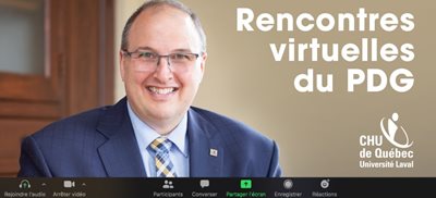 Tous les intervenants du CHU qui sont disponibles et souhaitent assister à ces rencontres hebdomadaires sont les bienvenus. Pour accommoder notre horaire professionnel et personnel, notre PDG offre deux moments virtuels par jour, soit un sur l’heure du dîner et un autre en soirée, juste avant que nos émissions préférées débutent.