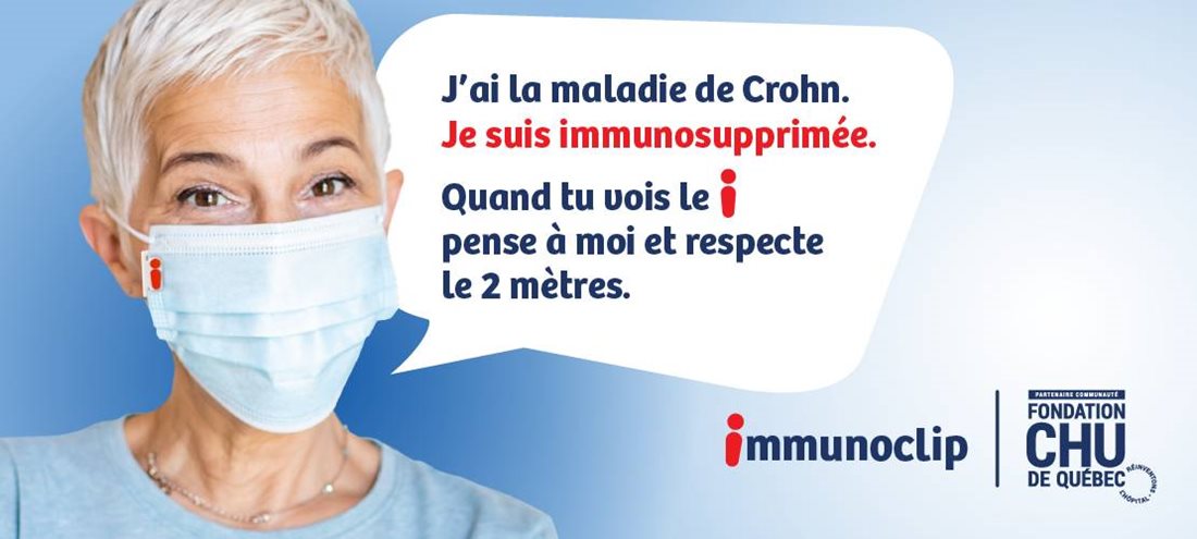 Les personnes immunosupprimées, parce qu’elles sont atteintes d’un cancer ou d’une autre maladie, peuvent désormais compter sur un indicateur symbolique pour informer les gens de leur condition en un simple regard! Cette épinglette, en forme de « i », pour « immunosupprimé », est conçue pour être accrochée sur un masque de protection individuelle.
