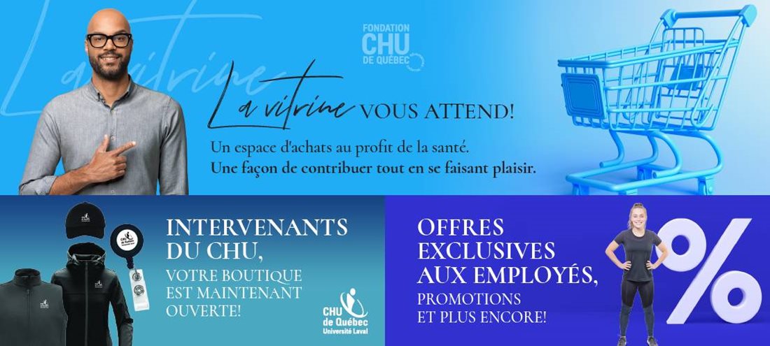 Eh oui, La vitrine est un espace d’achats virtuel où vous trouvez maintenant la Boutique CHU pour acquérir articles promotionnels, accessoires et vêtements aux couleurs du CHU de Québec-Université Laval.