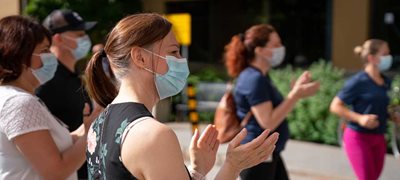 Danielle Goulet, présidente-directrice générale adjointe (en rose), accueille les intervenants avec d’autres gestionnaires lors du « pop-up » musical du 13 juillet dernier au CHUL.