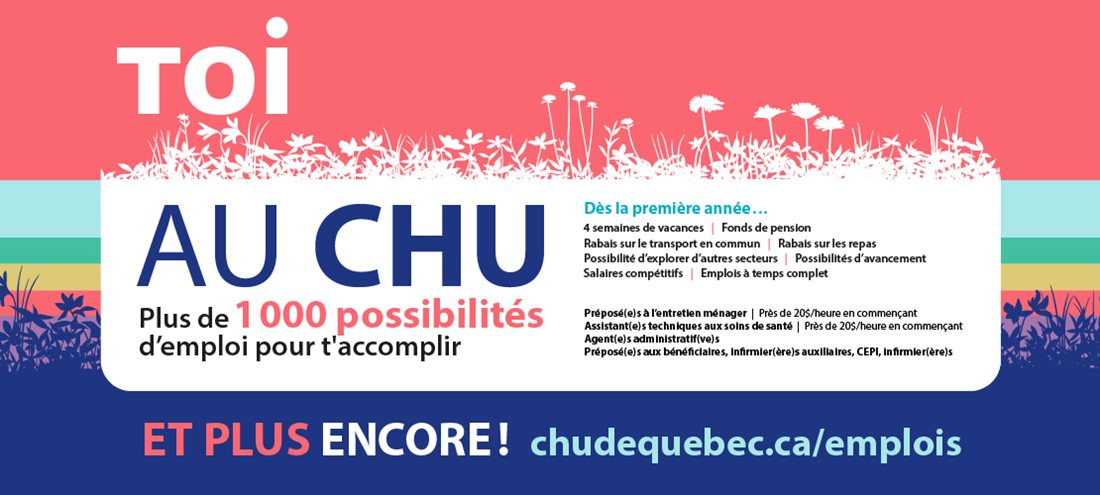 Cette année encore, le CHU de Québec-Université Laval prendra part à la Foire de l’emploi de la Capitale-Nationale et de Chaudière-Appalaches, du 28 avril au 5 mai, avec plus de 1 000 emplois à pourvoir dans tous les secteurs!