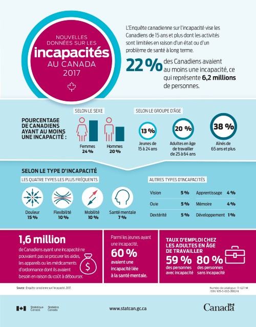 - Statistique Canada. Nouvelles données sur les incapacités au Canada, 2017. Enquête canadienne sur l’incapacité. 2018. https://www150.statcan.gc.ca/n1/fr/catalogue/11-627-M2018035.