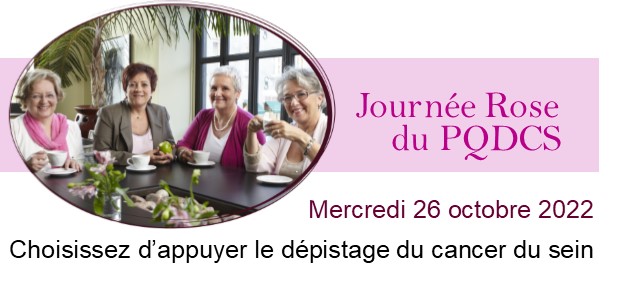 Dans le cadre du mois de la sensibilisation au cancer du sein, le Centre de coordination des services régionaux (CCSR) pour le Programme québécois de dépistage du cancer du sein (PQDCS) vous invite à appuyer la cause en portant du rose pour la 8e édition de la Journée Rose PQDCS le 26 octobre prochain.
