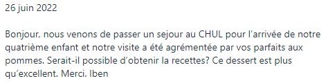 Vous avez été nombreux à nous la demander, et nos Services alimentaires ont généreusement accepté de la partager avec vous pour cuisiner vos récoltes : voici LA fameuse recette de parfait aux pommes du CHU de Québec-Université Laval, un dessert sain, savoureux et tellement facile à préparer!
