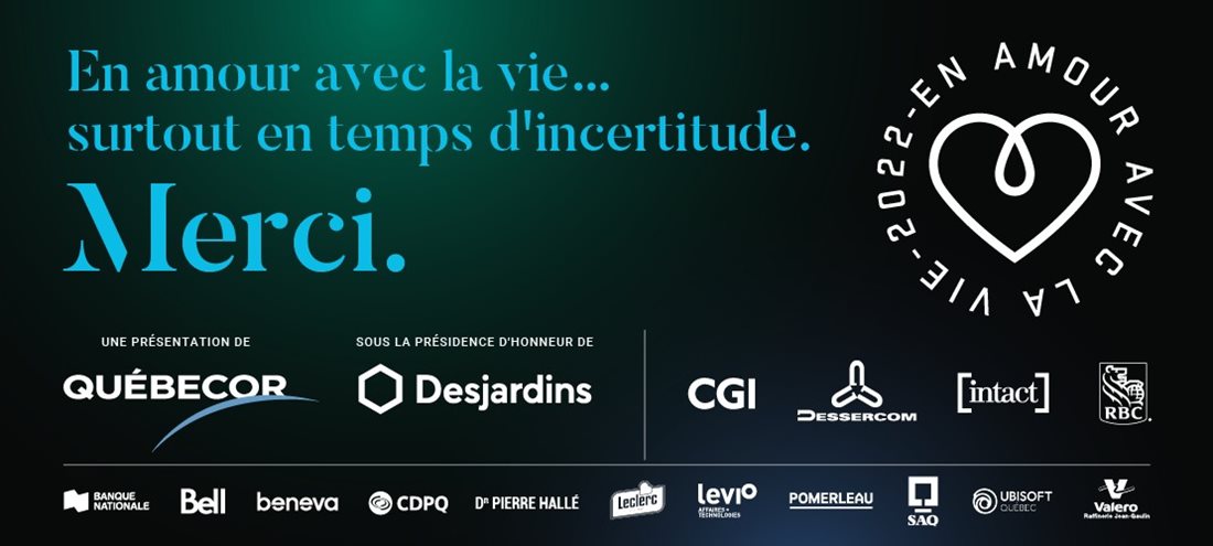 Soulignons l’engagement remarquable de Québecor, partenaire présentateur de l’événement En amour avec la vie, de M. Guy Cormier, président et chef de la direction du Mouvement Desjardins et président d’honneur, ainsi que de nombreux partenaires.