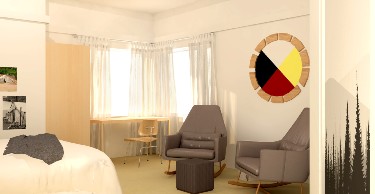 Aménagement créé en coconstruction avec des partenaires autochtones. Design de Bénédicte Ravel, stagiaire en architecture au CHU.