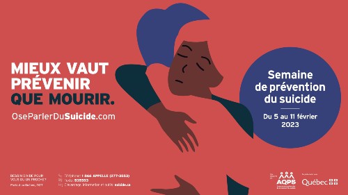 Saviez-vous que chaque jour, trois Québécois s’enlèvent la vie? Ce sont nos parents, nos enfants, nos frères et sœurs, nos amis. Nous nous devons de tout mettre en œuvre pour éviter d’autres pertes tragiques. Pour la Semaine de prévention du suicide 2023, brisons le tabou! Osons ouvrir le dialogue, parce que la prévention fait une réelle différence.