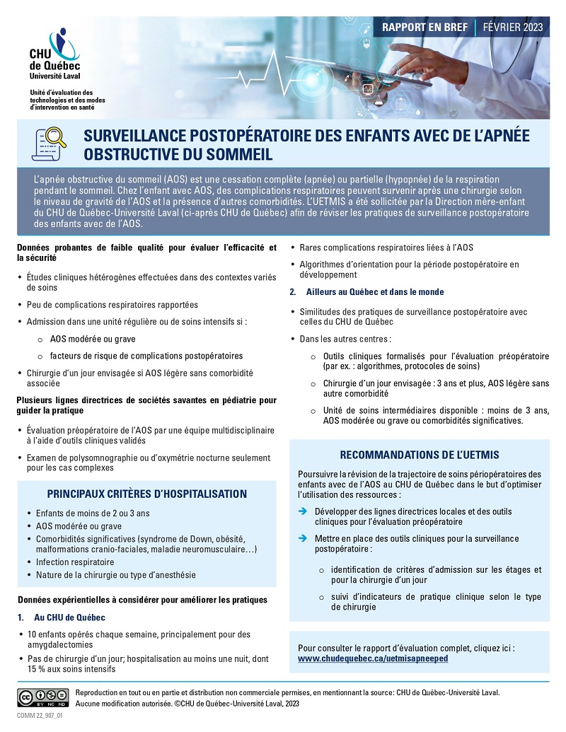 L’apnée obstructive du sommeil (AOS) est une cessation complète (apnée) ou partielle (hypopnée) de la respiration pendant le sommeil. Chez l’enfant avec AOS, des complications respiratoires peuvent survenir après une chirurgie selon le niveau de gravité de l’AOS et la présence d’autres comorbidités. L’UETMIS a été sollicitée par la Direction mère-enfant du CHU de Québec-Université Laval afin de réviser les pratiques de surveillance postopératoire des enfants avec de l’AOS.
