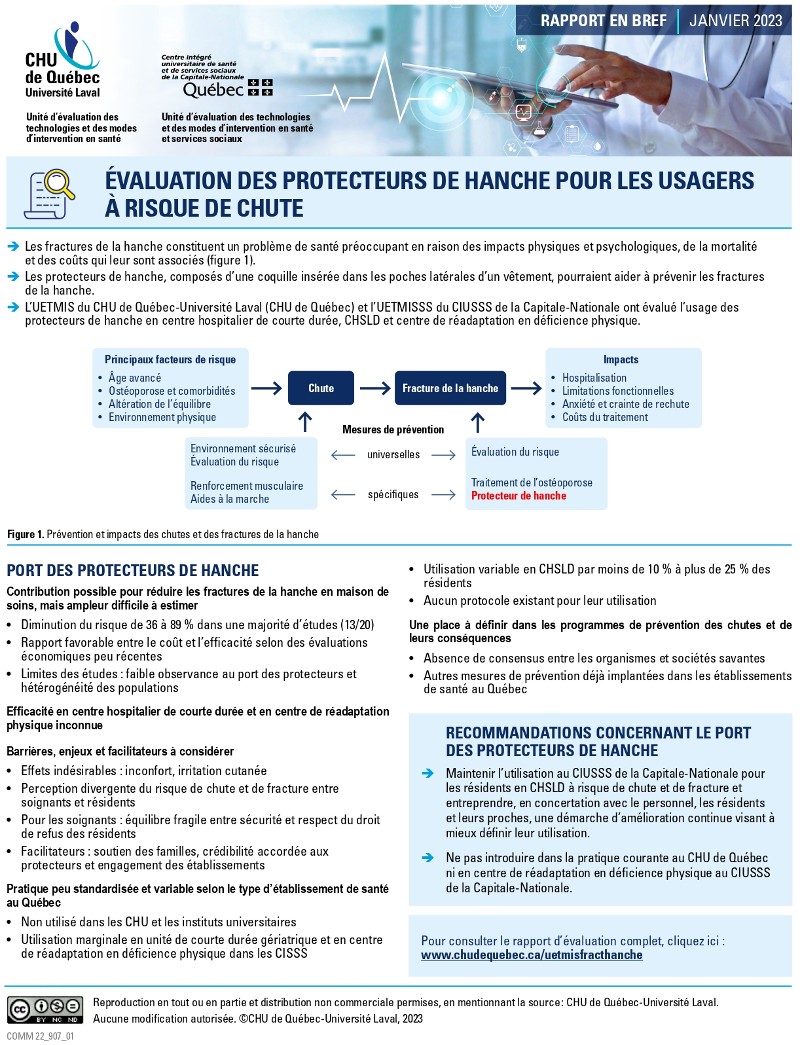 Dans un récent rapport, les unités d’évaluation des technologies et modes d’intervention en santé (UETMIS) du CHU de Québec-Université Laval et du Centre intégré universitaire de santé et services sociaux (CIUSSS) de la Capitale-Nationale, ont analysé la pertinence de l’utilisation de protecteurs de hanche pour la prévention des fractures chez les personnes à risque de chute hospitalisées en centre de soins de courte durée, admises en CHSLD ou en centre de réadaptation en déficience physique. Ce nouveau rapport vise à déterminer si cette mesure devrait être intégrée aux programmes de prévention des chutes.
