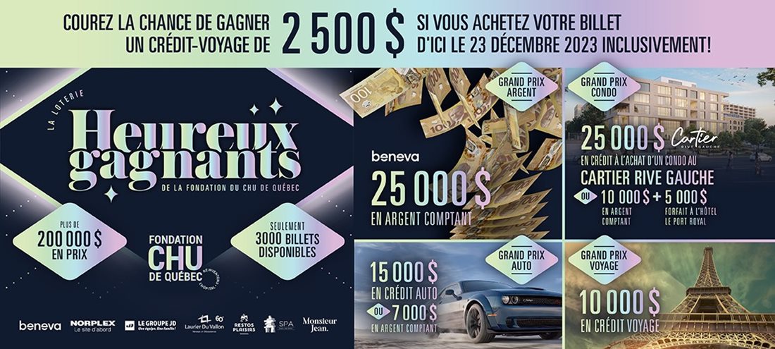 Appuyer les nombreux projets des équipes du CHU tout en courant la chance de gagner de magnifiques prix? Voilà deux bonnes raisons de participer à la très attendue loterie philanthropique Heureux gagnants 2024 de la Fondation du CHU de Québec.