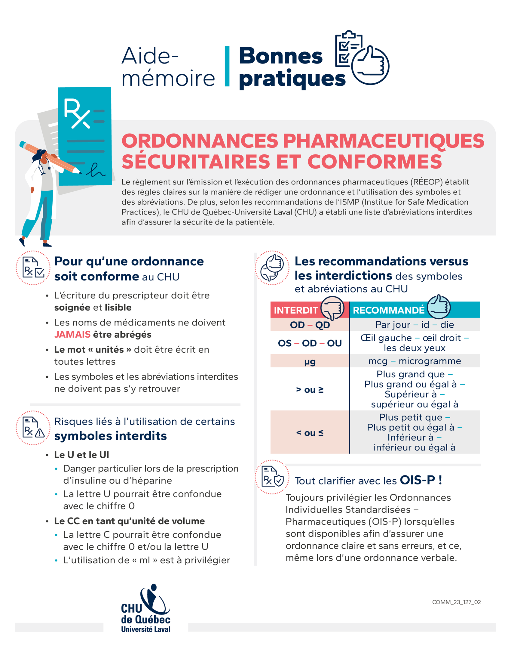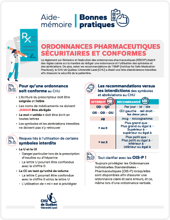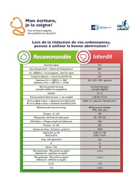 Le CHU de Québec-Université Laval (CHU) a établi une liste d’abréviations et de symboles qui ne doivent pas être utilisées dans la rédaction des ordonnances, car ils pourraient entraîner des erreurs de lecture ou d’interprétation. Cette liste est basée sur les recommandations de l’Institute for Safe Medication Practices (ISPM).