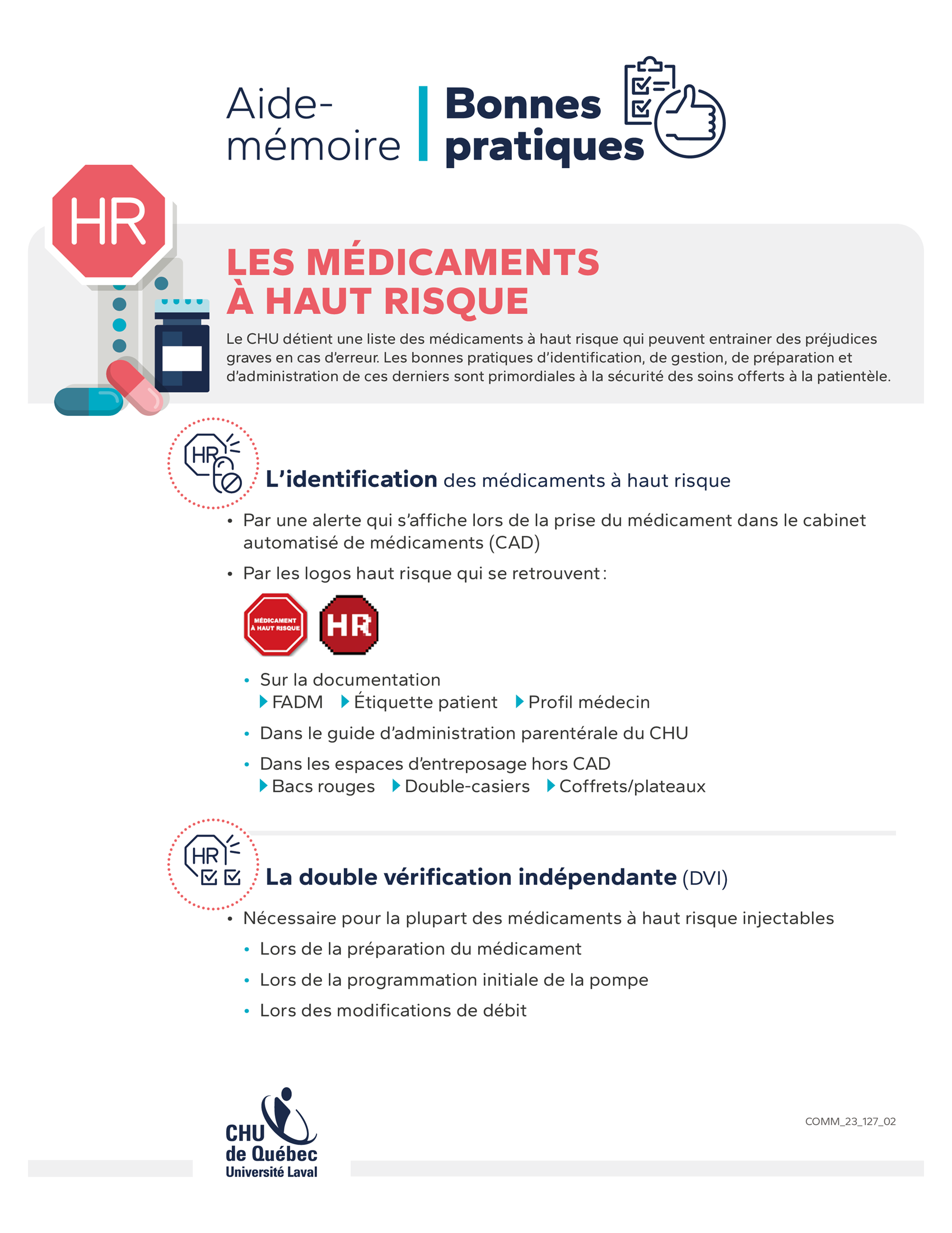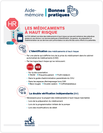 Les médicaments à haut risque sont ceux qui pourraient entraîner des préjudices graves en cas d’erreur. Une liste de ces médicaments à haut risque est diffusée sur Le SPOT dans la section « médicaments ».