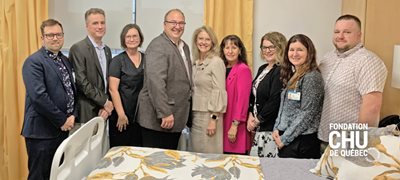 Photo principale : la chambre a été inaugurée à l’automne 2023 en présence des personnes suivantes (da gauche à droite) : M. Stéphane Tremblay, directeur des soins critiques, CHU; Dr Julien Clément, directeur des services professionnels et des affaires médicales, CHU; Dre Chantal Morency, médecin – soins palliatifs, cheffe du service de soins palliatifs; M. Martin Beaumont, président-directeur général, CHU; Mme Marie-Claude Paré, présidente et cheffe de la direction, Fondation du CHU de Québec; Mme Danielle Goulet, présidente-directrice générale adjointe, CHU; Mme Audrey Gagnon, directrice – médecine, CHU; Mme Julie Nicol, cheffe d'unité, médecine interne, soins palliatifs et unité de soins virtuels (USV); M. Jean-Sébastien Leclerc, chef d'unité, médecine interne, soins palliatifs et unité de soins virtuels (USV).