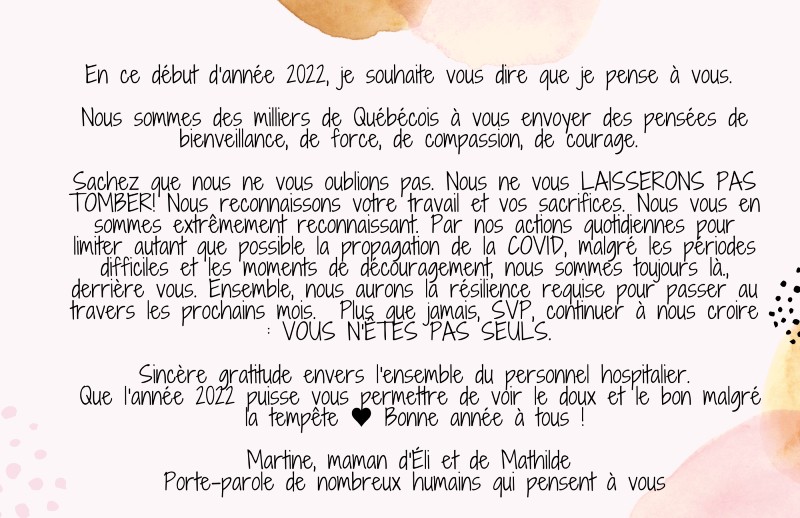 Les mots me manquent lorsque je pense aux sacrifices que vous faites pour prendre soin de nous tous les jours. Vous êtes une source d’inspiration et de courage pour tous les Québécois qui se serreront les coudes à nouveau en cette fin d’année en espérant alléger, ne serait-ce qu’un peu, votre fardeau.